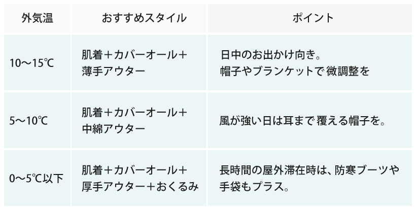 外出時の基本は「肌着+カバーオール+ベスト(またはアウター)」ぐらいが目安となります。
