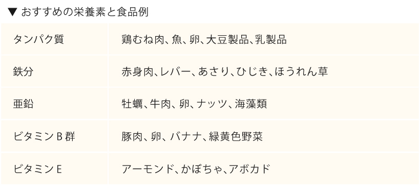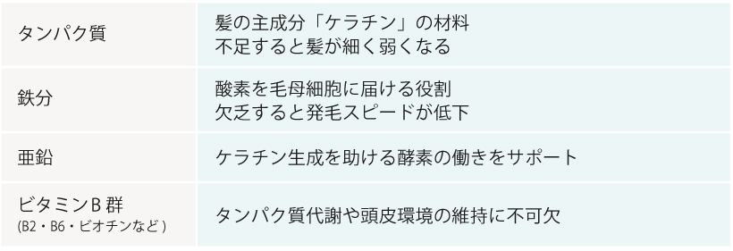髪の主な成分はタンパク質(ケラチン)です。また、成長には鉄分・亜鉛・ビタミン類も欠かせません。そのため、産後の髪の回復には、十分な栄養が必須です。
