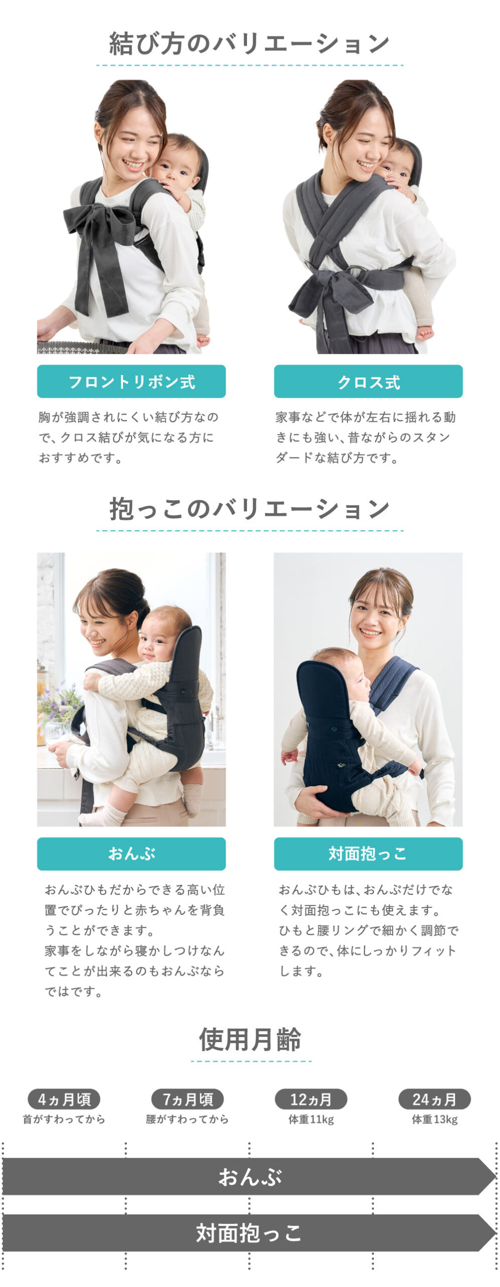 | 使用月齢 | 首がすわった乳児期(4ヵ月頃)~24ヵ月(体重13Kg) |